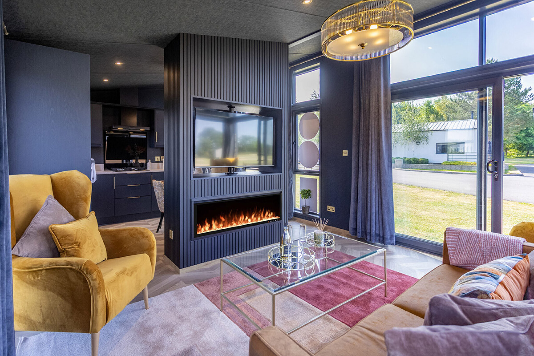 A feature fireplace provides a focal point in the living area, creating a warm and inviting atmosphere. For added convenience, the home is equipped with USB charging points. The external design is just as customisable as the interior; you can choose the cladding colour to match your style, with a range of matt finishes that have a natural wood grain embossing. With the optional Residential spec, the lodge is insulated to keep you warm in the winter and cool in the summer, ensuring it is a perfect getaway all year round.