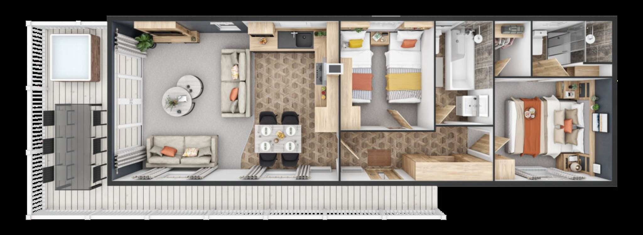 You can choose from a variety of floorplans two or three bedroom wide, including larger models like 42 × 14 and 45 × 22. The standard spec includes integrated kitchen appliances such as fridge-freezer, microwave, oven and hob. Dining area with free-standing table and chairs, coffee table, feature fireplace, king-size bed in the master bedroom are among the comfort touches. USB charging sockets and brass style fittings are added extras that feel thoughtful.