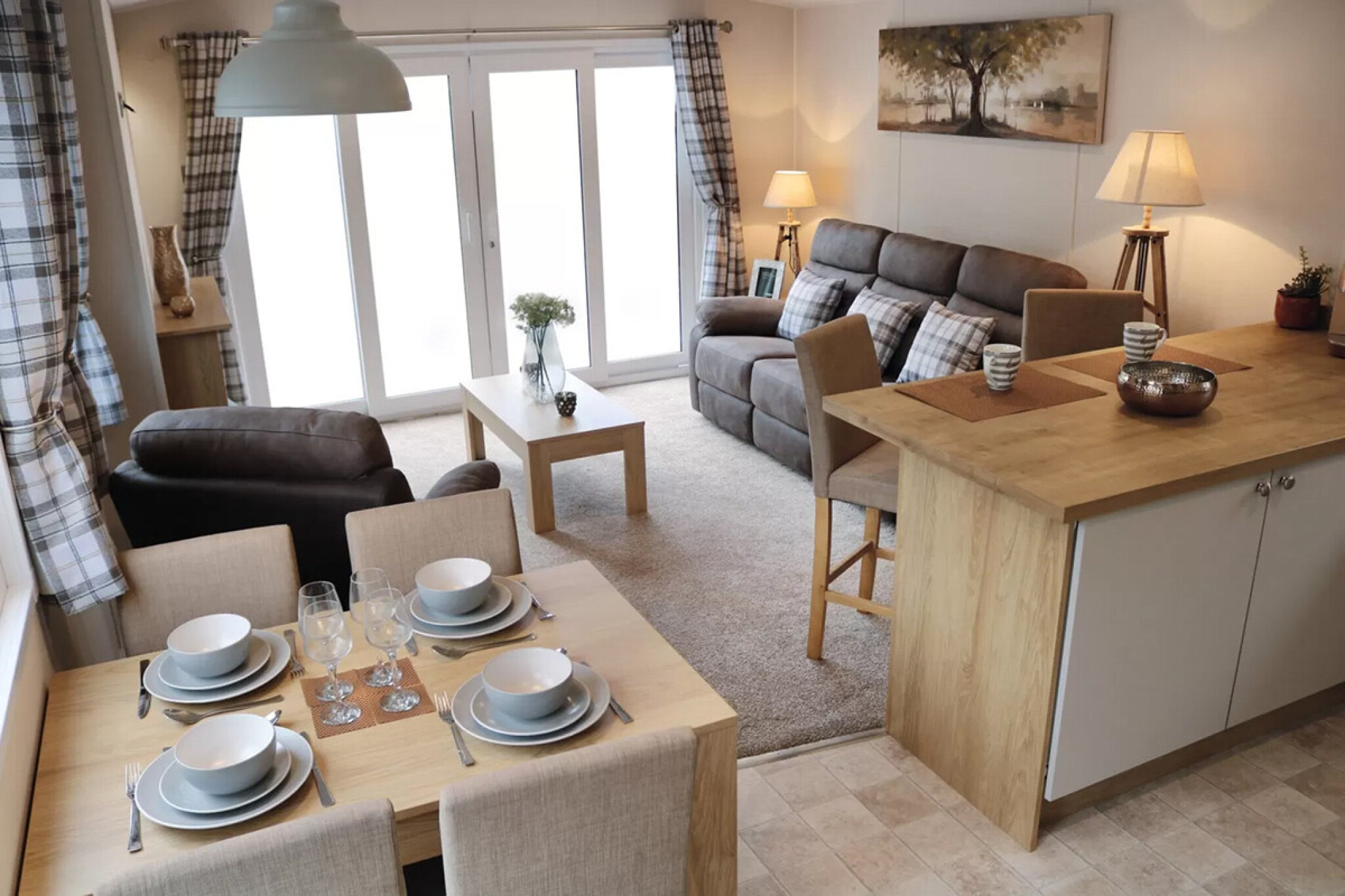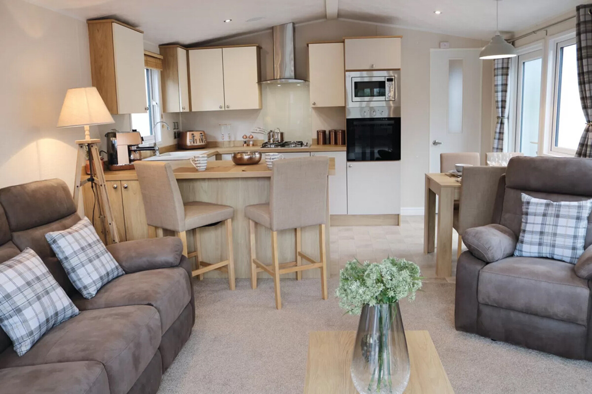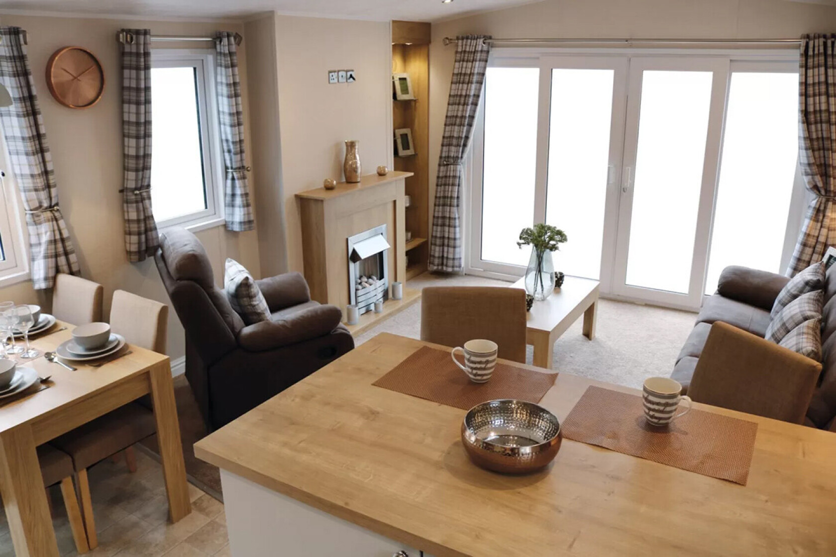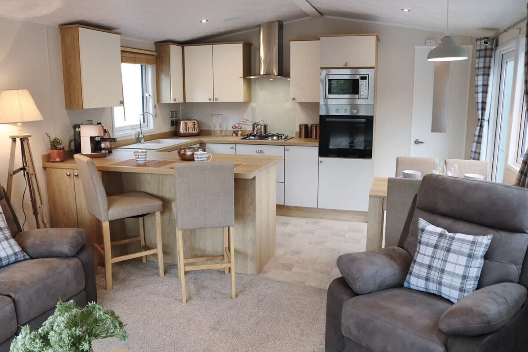 Its interior draws inspiration from Highland style, combining soft neutral colours with subtle tartan touches for a look that is both classic and contemporary. The open plan design creates a natural flow through the living, dining and kitchen areas, making the lodge perfect for everyday life as well as relaxed entertaining.