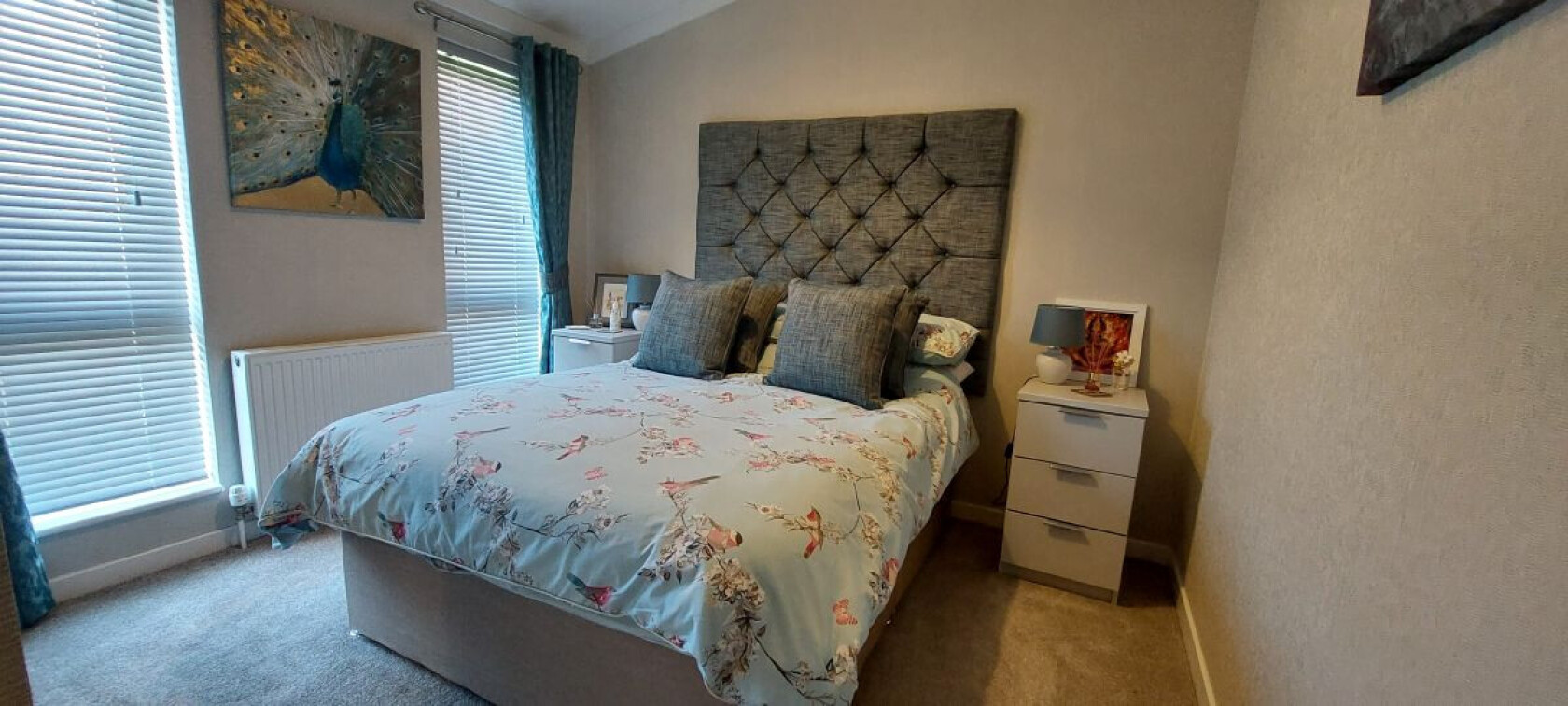 Measuring 45 × 22 ft and built to residential specification, this two-bedroom, two-bathroom lodge combines contemporary elegance with thoughtful design. The sleek exterior, finished in CanExel cladding, features long slender windows, a striking dormer entrance, and two sets of French doors opening onto a spacious wraparound anthracite-grey composite deck—perfect for soaking up the south-facing views from sunrise to sunset.