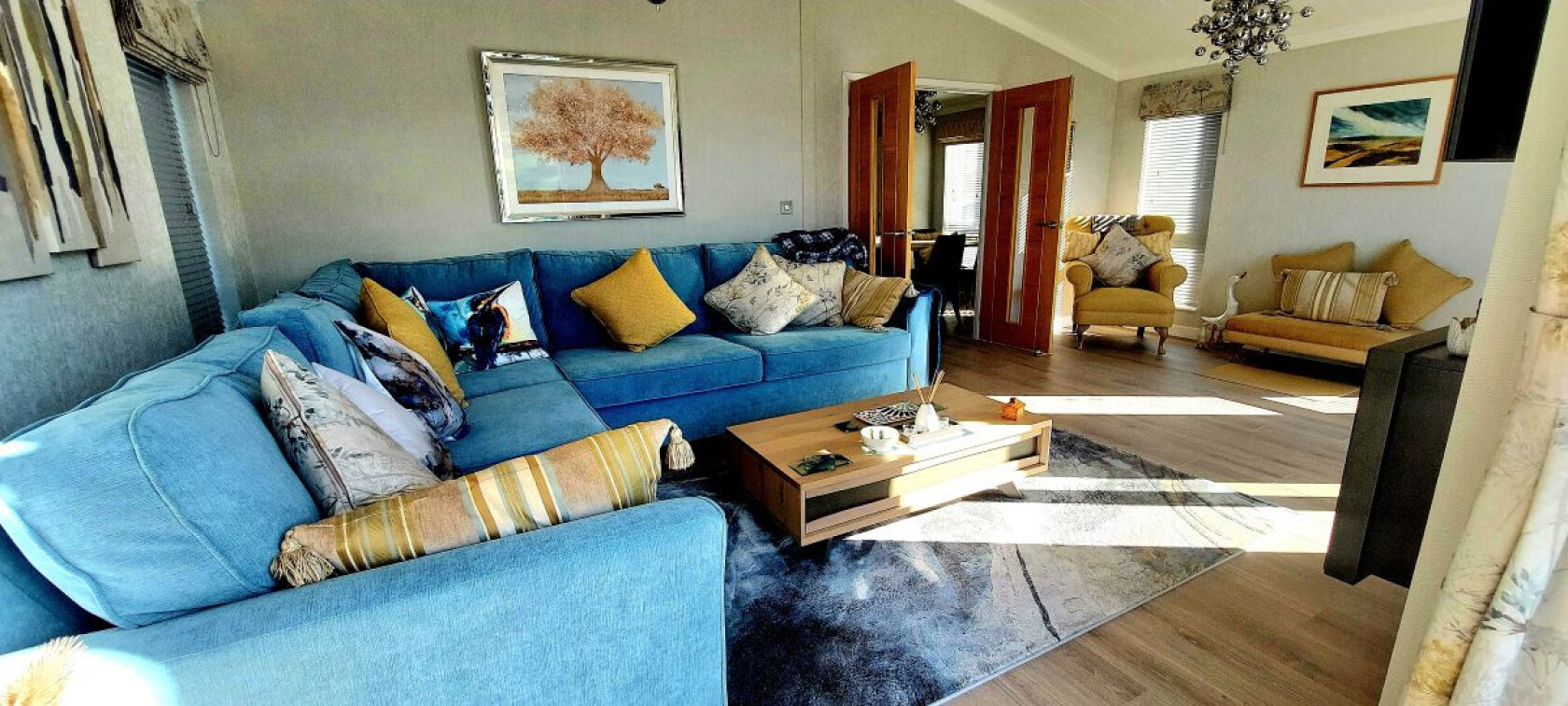 The lounge offers a large L-shaped sofa, gas fire, coffee table, and fully lined curtains with botanical-inspired soft furnishings.