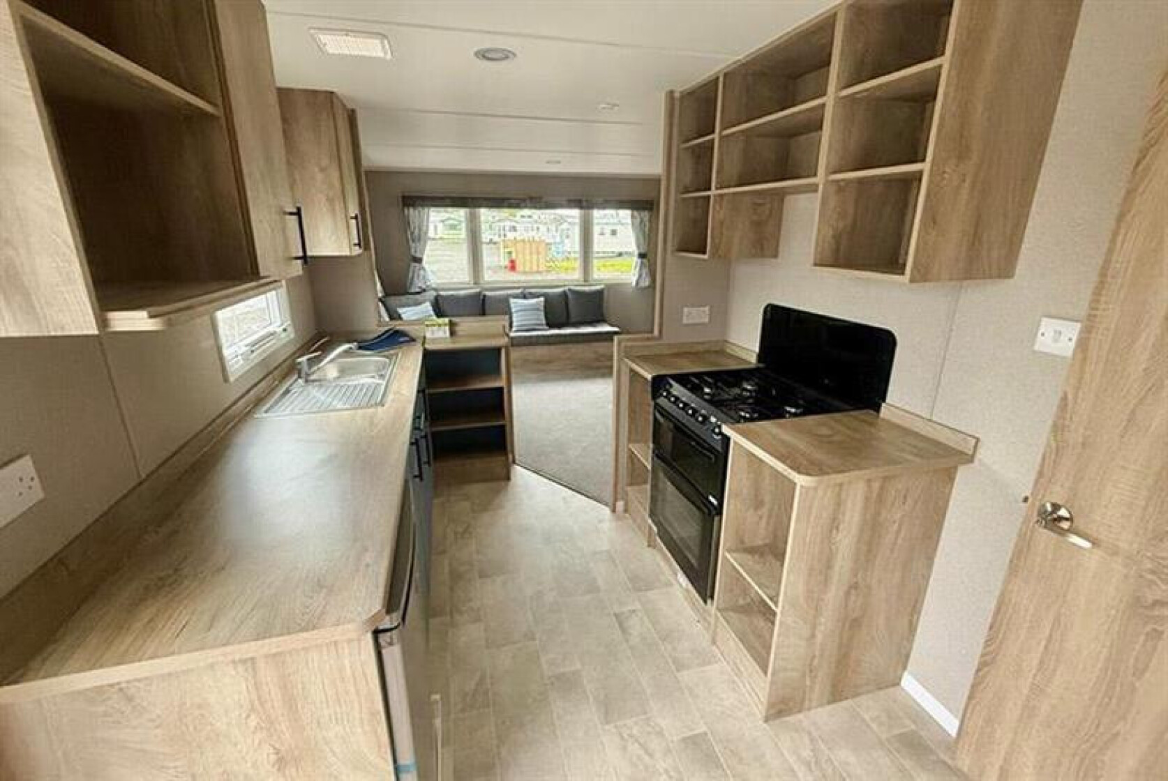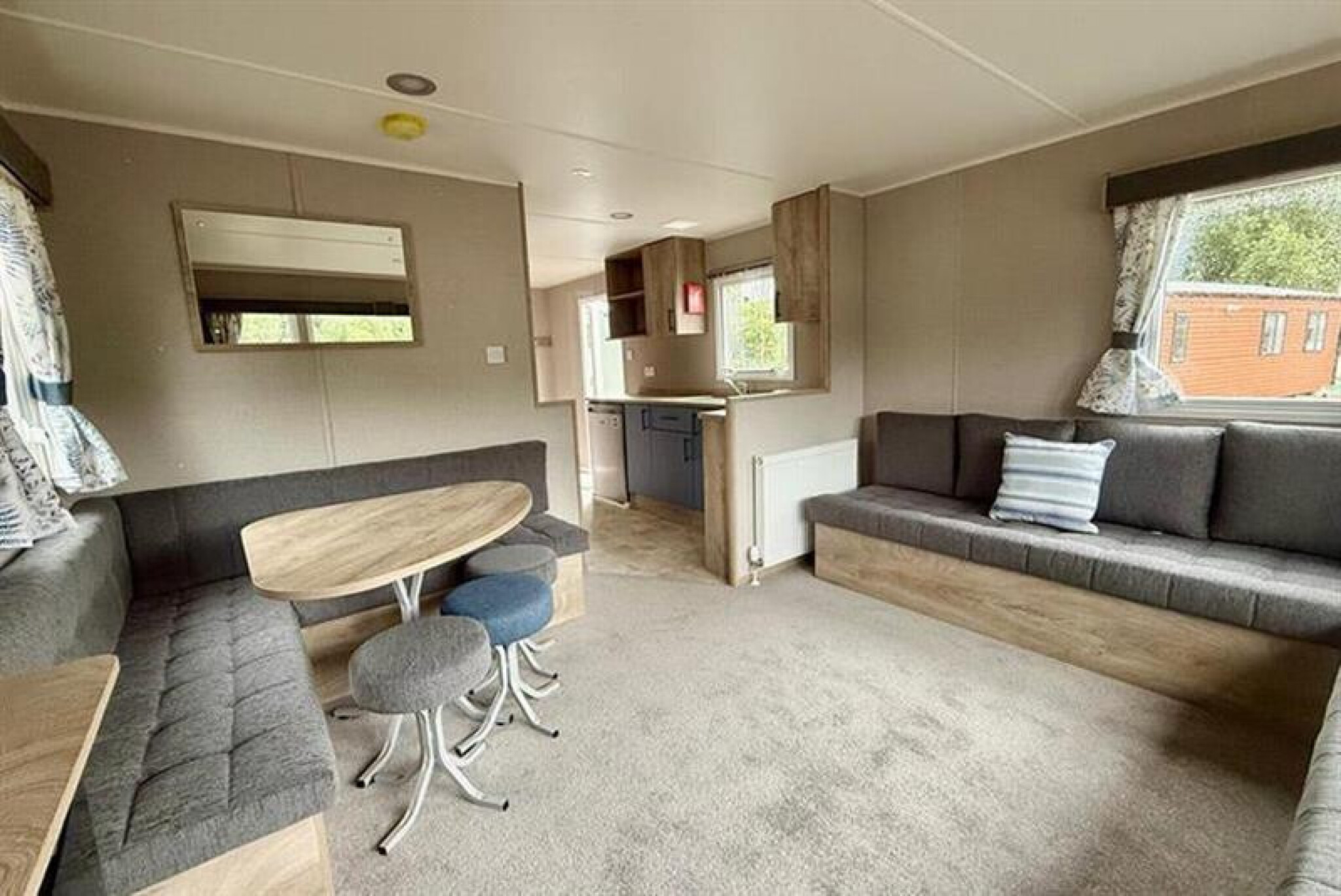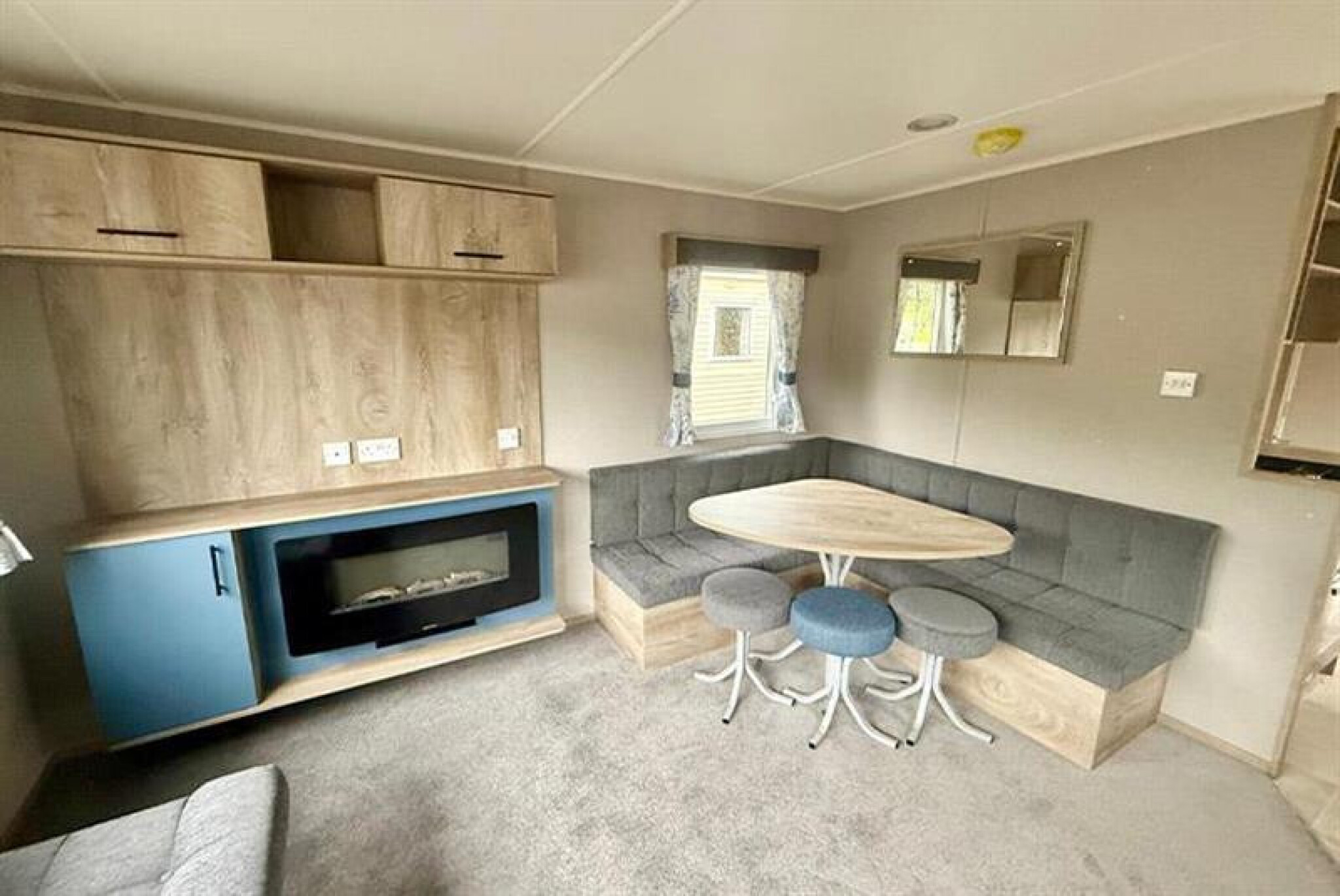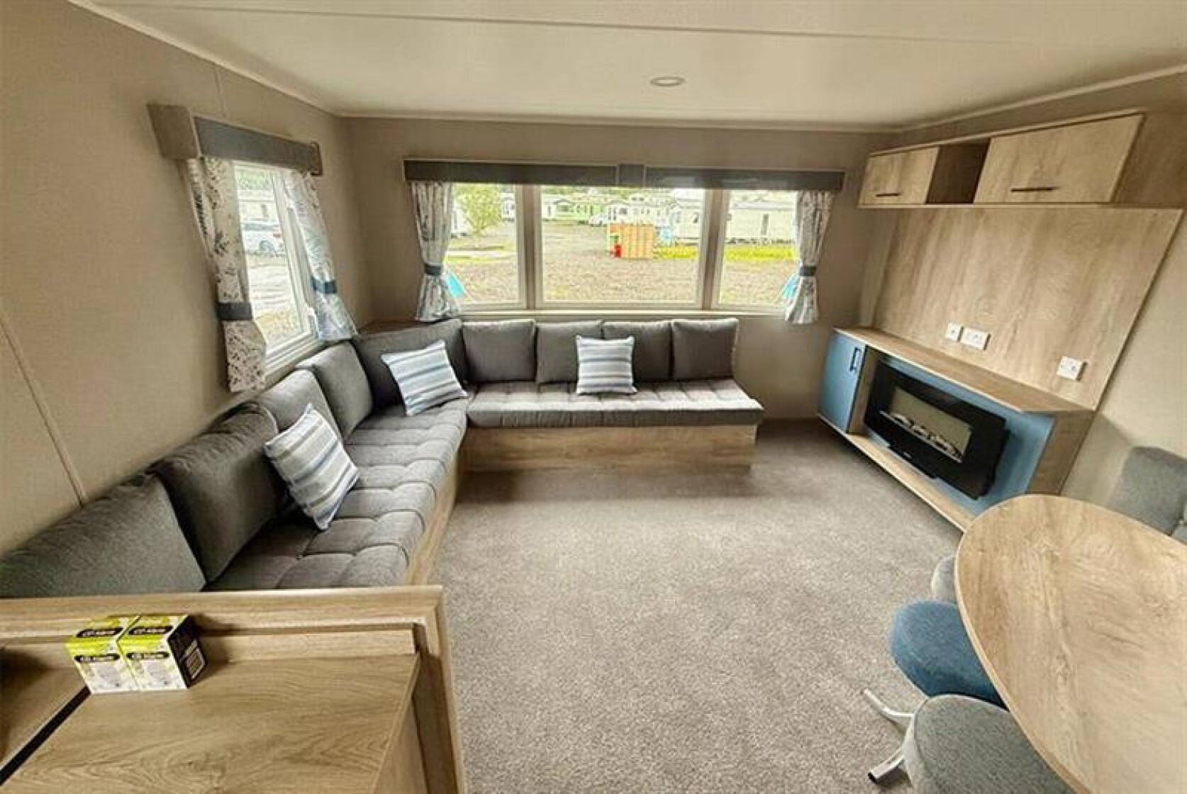 Warm and inviting – Open-plan living, plush sofas, and a sleek electric fire to set the mood.