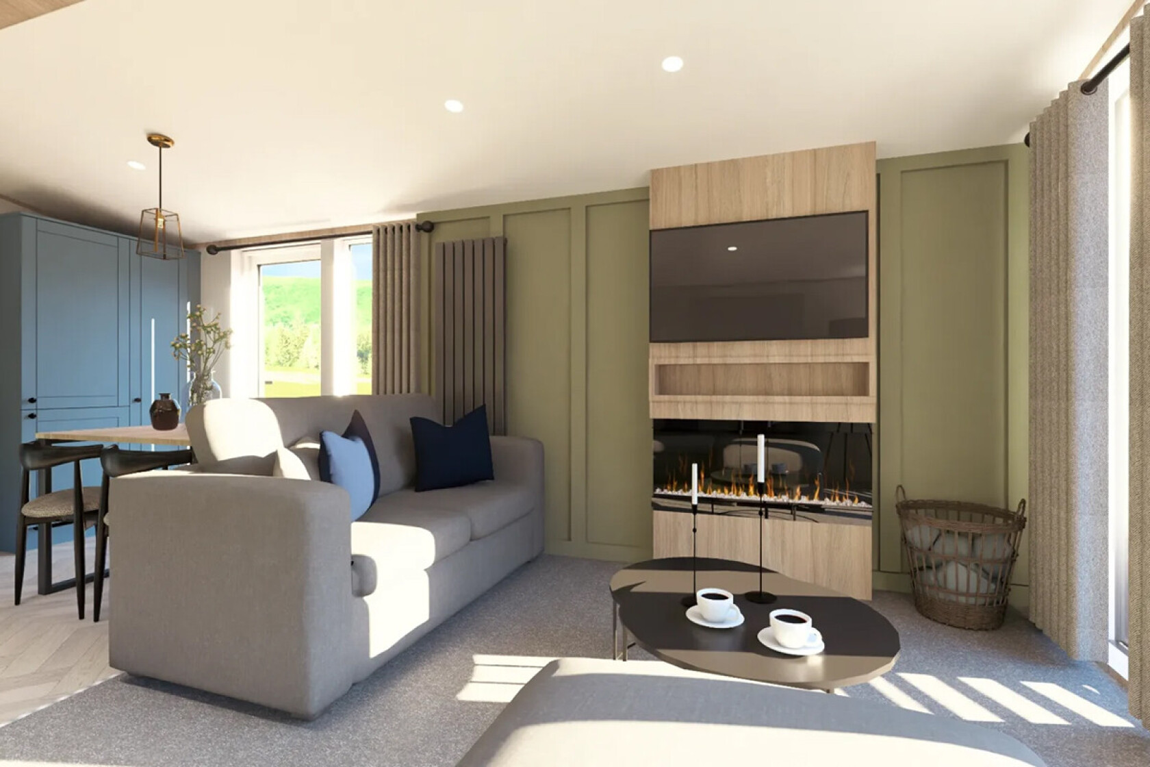 The open plan lounge is filled with natural light from French doors, creating a bright and sociable space. Deep blue tones and neutral furnishings bring a modern look, while soft sofas and elegant touches make it a relaxing spot. The kitchen stands out with bold blue cabinets, wood countertops, and practical appliances, making meal preparation simple and enjoyable.