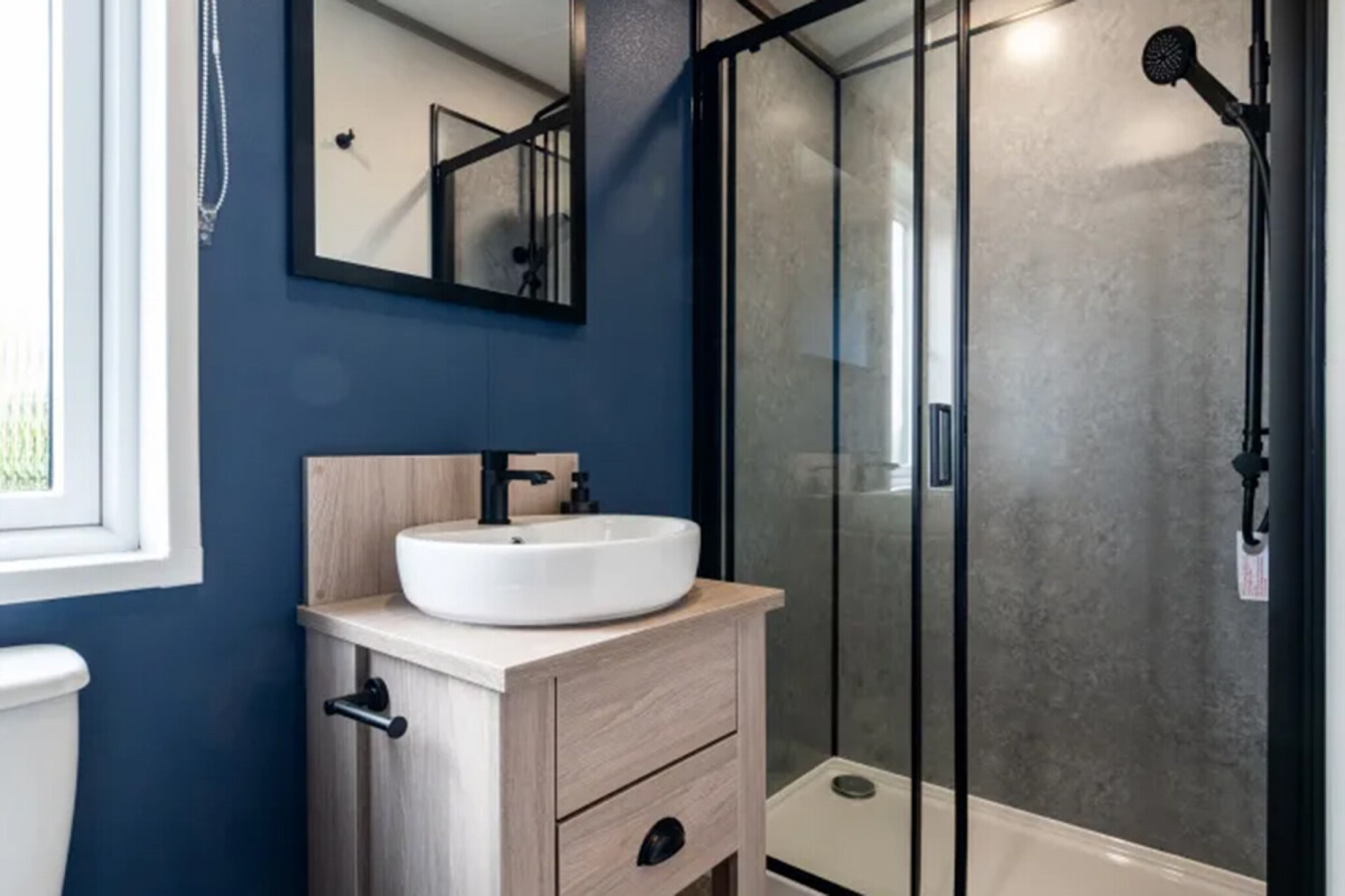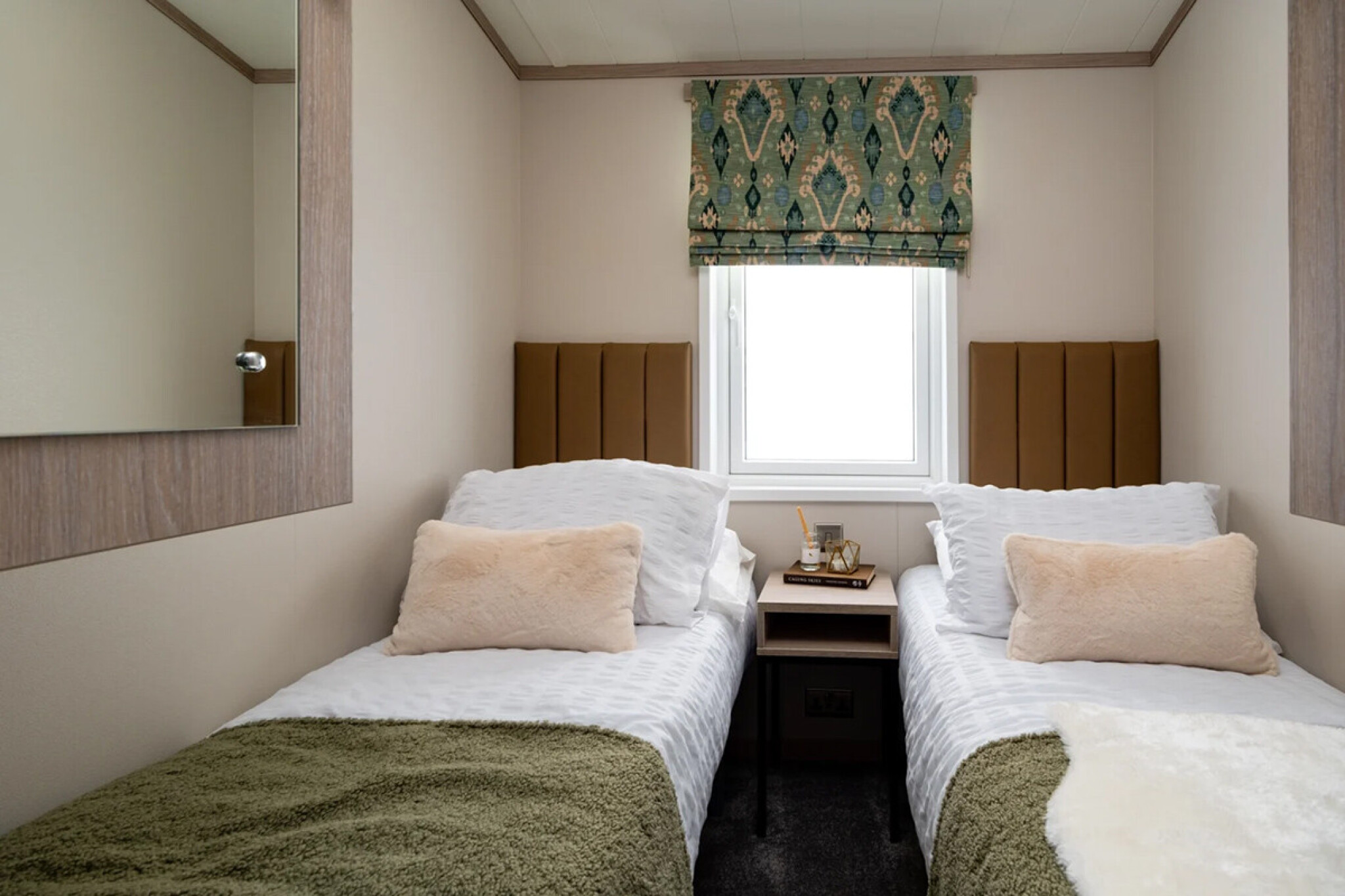 The master bedroom offers its own dressing area and ensuite, giving a private retreat feel, while the twin rooms provide generous space and calming finishes. Bathrooms feature sleek black fittings, wood accents, and smart storage, combining function with contemporary design.